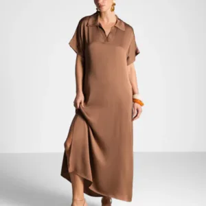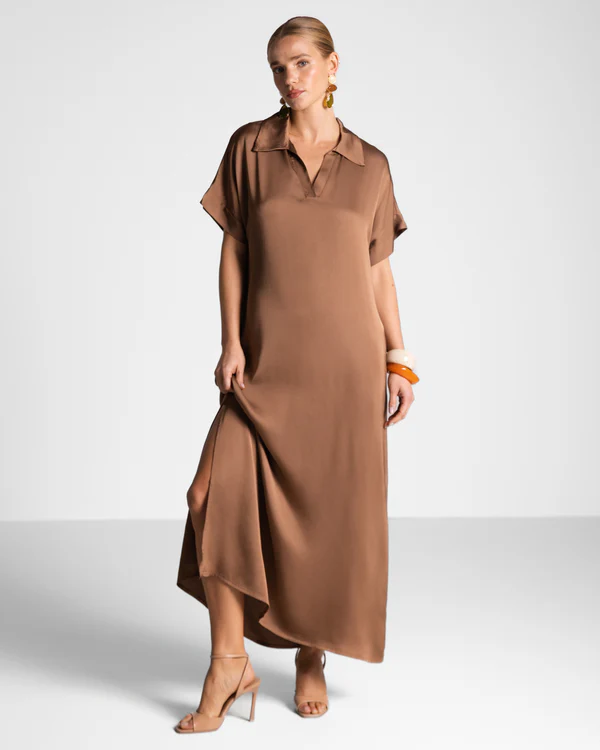 Combining relaxed ease with refined design, this kaftan dress is crafted from luxurious Italian satin that drapes beautifully over the body. The collared neckline adds a polished touch, while side splits enhance the fluid silhouette. The loose, flowing fit makes it a versatile piece for both casual days and elevated evenings.